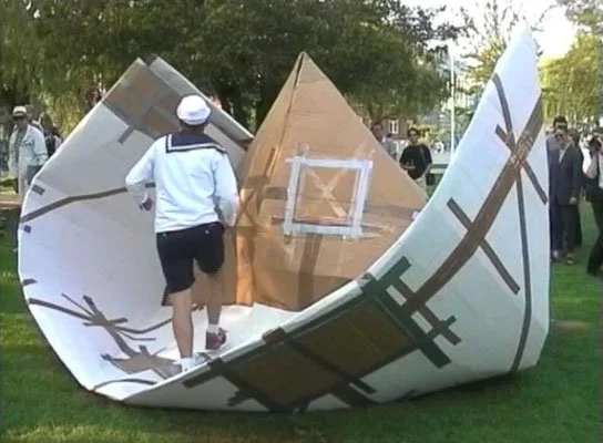 Dressed up as a sailor, I enter the park, where people are gathered around a 7 x 10 meter big cardboard sheet, taped together of cardboard plates and boxes. I start to fold the sheet in different ways. In the beginning it is not clear, what I am trying to achieve. I have trouble surveying the situation, because of the scale of "my paper". After a while though, it is getting clearer, that I am trying to fold a big paper boat or a paper hat. But the thick cardboard gives me some trouble. Normally, when you fold a paper boat, you just use your fingers. But here I have to use the weight of my whole body to fold the cardboard, which makes the folding physically demanding and less elegant, and I become more and more exhausted. Finally I actually manage to finish the boat, but then I have some problems with the structure of the cardboard, which becomes lose and floppy. That makes is even harder for me to transport the 50 kilo boat towards the river only 10 meters away. In order to make the transport easier, I try to "wear" the hat, with the result of me walking in the wrong direction. After 30 minutes of folding and transport I reach the river and launch the boat in the water. The boat can easily carry me, so I lay down, exhausted, until some people in a canoe comes by and pick me up. This performance obviously also deals with a return to childhood. Apart from the actual play of folding paper boats, the scale of the boat made me look like a little child. The piece has a reference to H.C.Andersen as well. He was actually born in Odense, and in his fairy tale of the Little Tin soldier and The Ballerina, the Tin soldier is sailing in a paper boat.