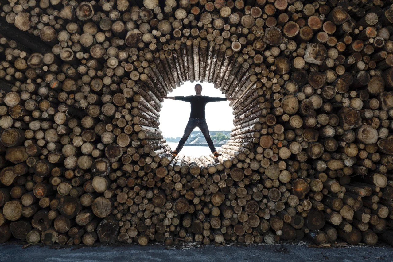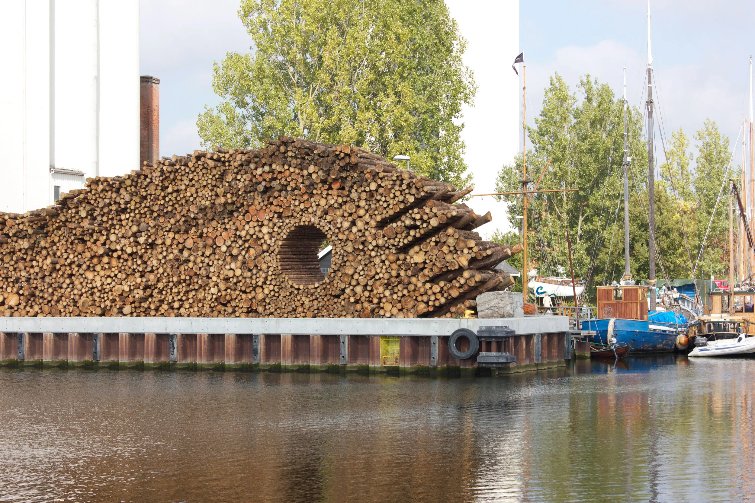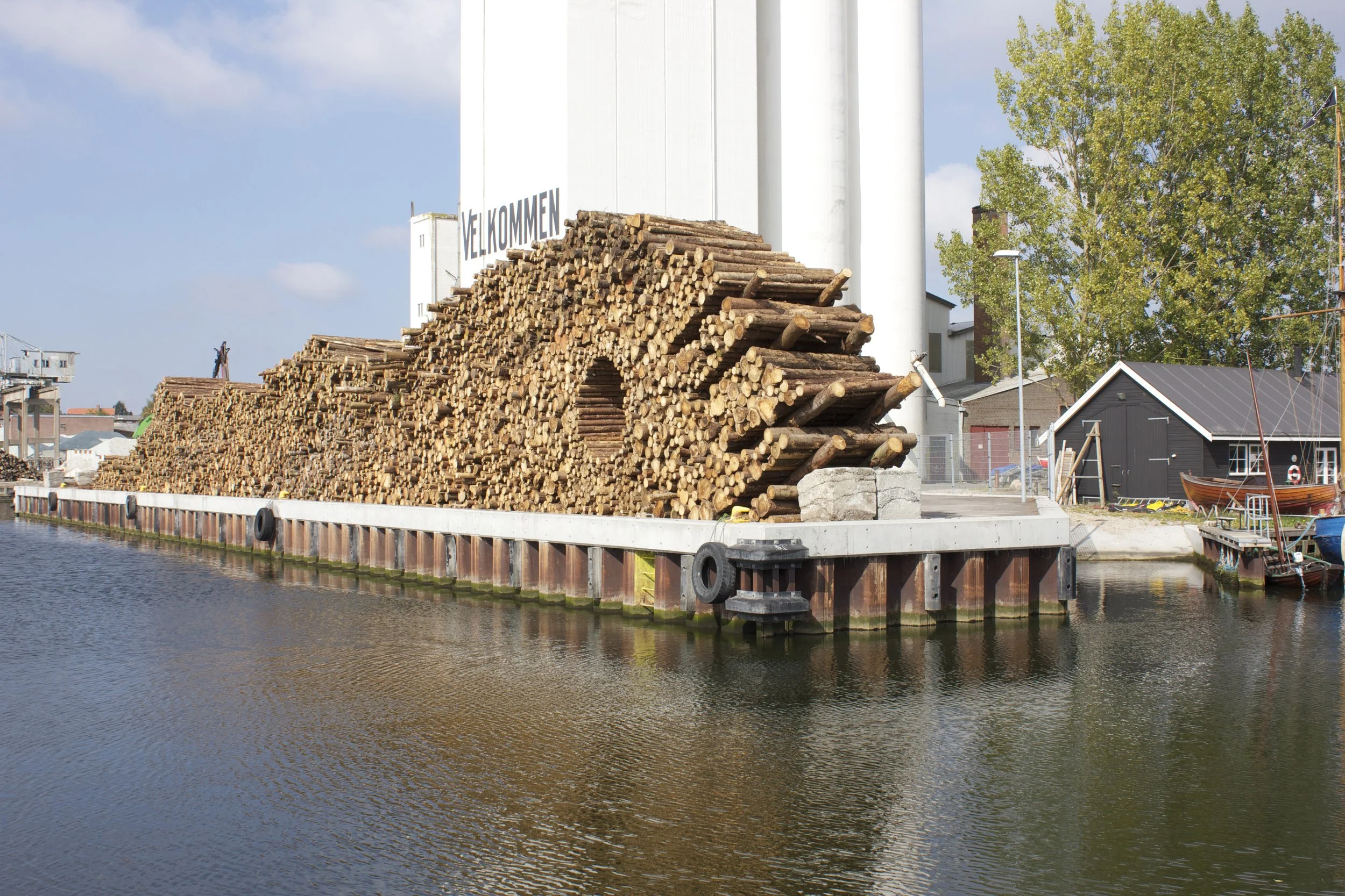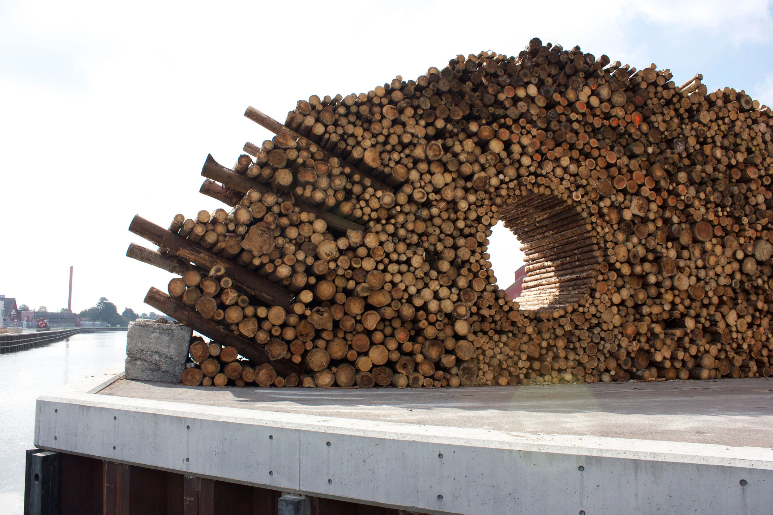 The installation mimes the piled-up tree trunks at Næstved Habour. I am very inspired by the power and brutality the tree trunks represent. The idea behind Hullet was to create an image that refers to the beauty and the sculptural elements of stacking the tree trunks, while at the same time creating a surprising and poetic moment with the circular hole that interferes with the structure of the pile.