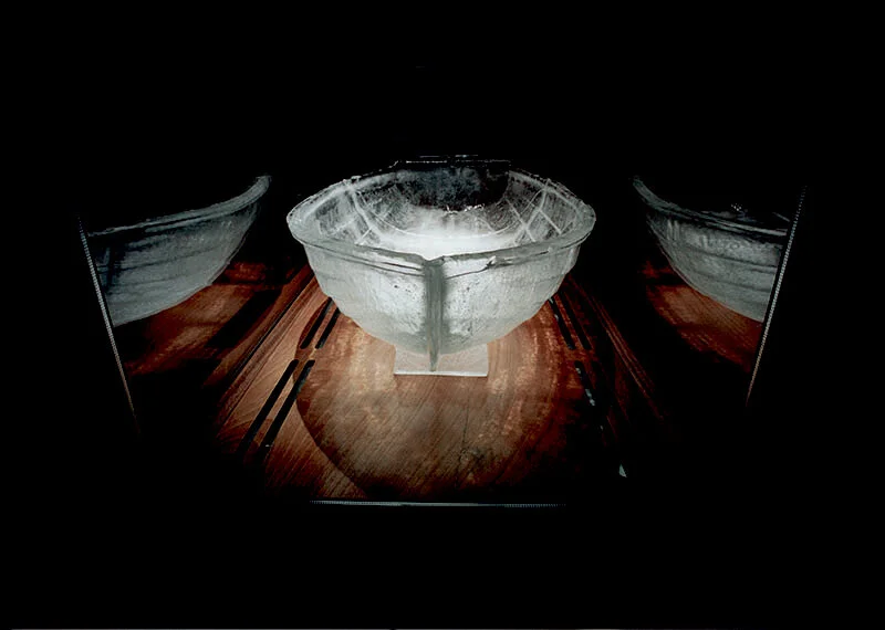 glass case made of heat-reflecting glass, meranti wood and okumé wooden boards.