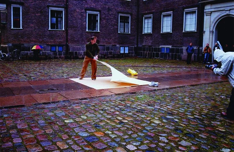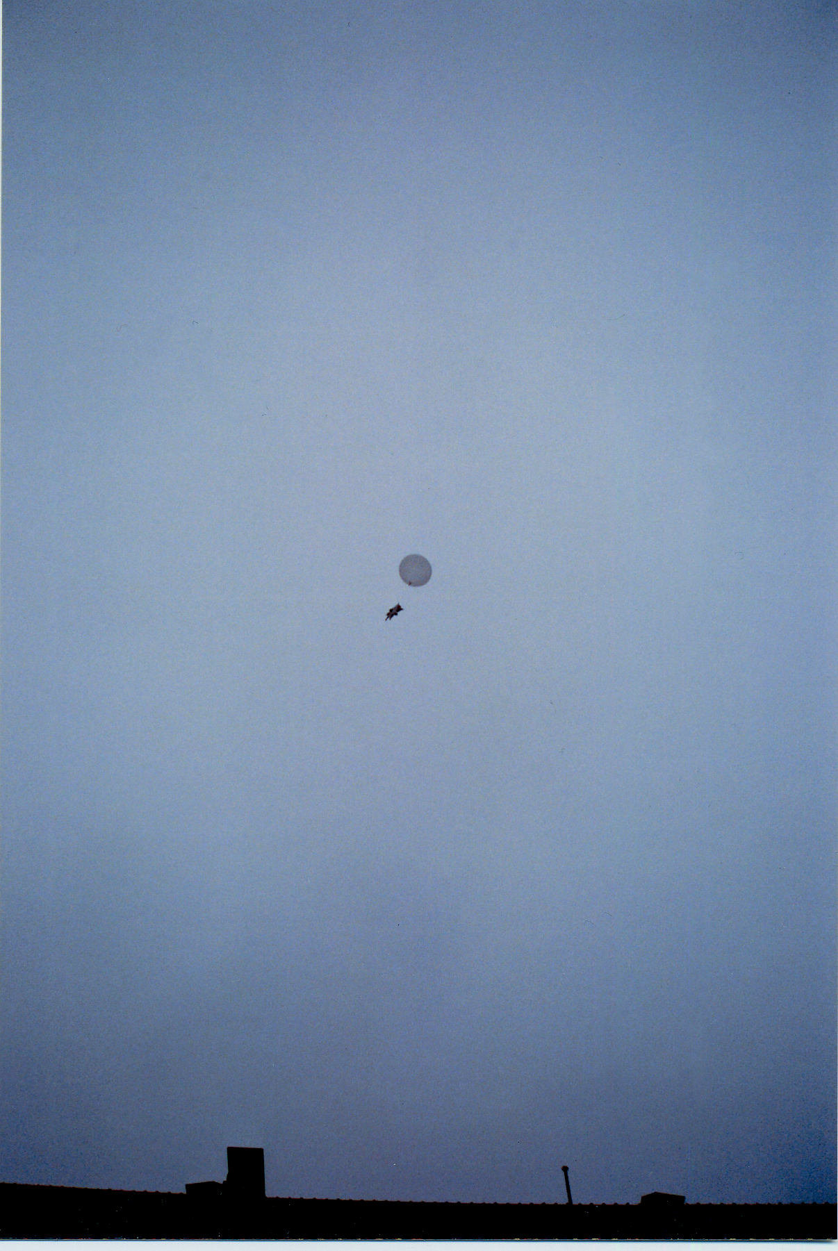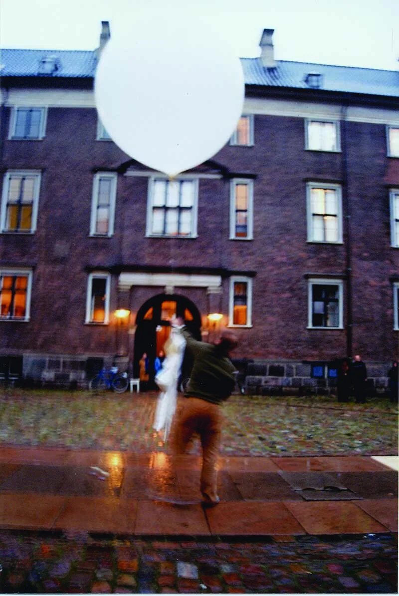 30 min performance for the opening of From dust to dusk, 2 x 2 m white paper, white rubber balloon, helium, and a white string, The yard of The Royal Danish Art academy next to Charlottenborg Exhibition Hall, Copenhagen, October 2003