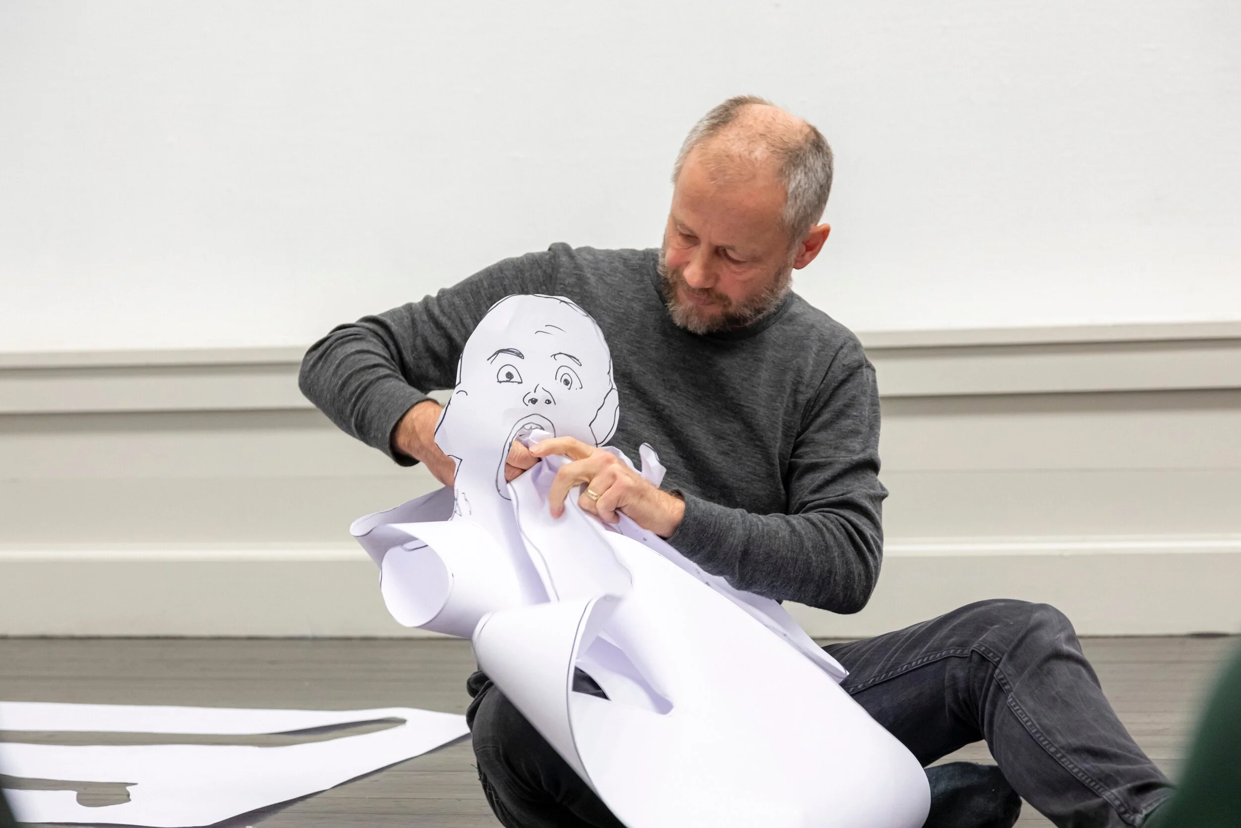 A large piece of paper is cut out to a paperman. I then start to animate his movements. He comes alive and slowly starts to consume himself – starting with his feet. The sound of noisy chewing indicates pleasure in what he is tasting. He continues to consume himself until his face is curled up and eaten through his mouth. He is now literally inside out. I then placed the curled piece of paper in the cut-out silhouette, where it looks like a curly snake or shit. The performance can be interpreted as many things; a destructive self-obsession, greediness or to be self-tasting. The performance is also a kind of self-portrait; both literally due to the outlining of my body but also due to the title ‘Paperman’: Can I work too much and become too absorbed by the material, paper, until the level where I get lost in it without the ability to see anything else?