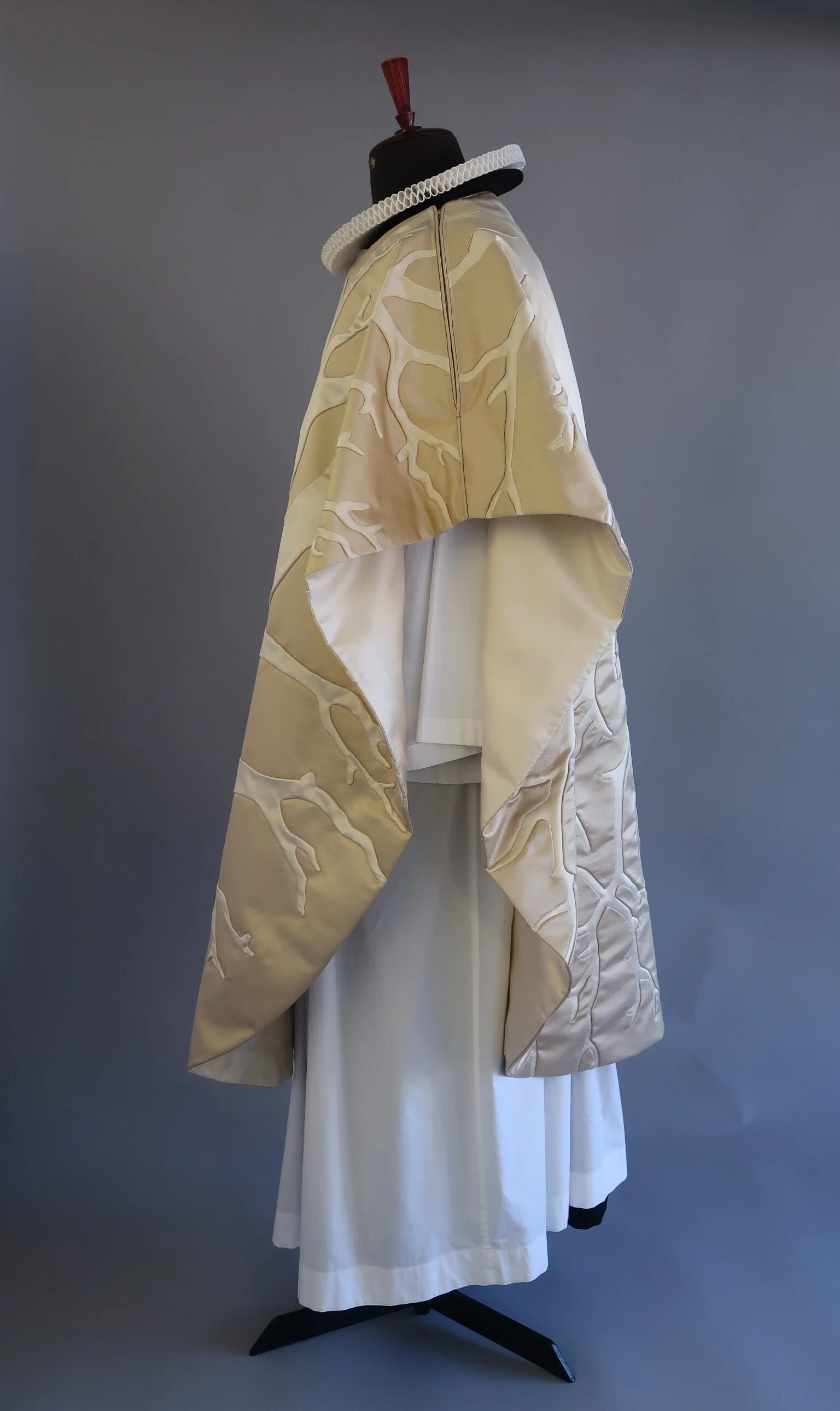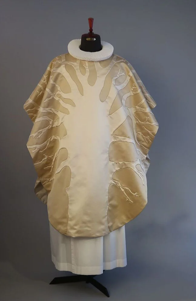 Chasuble designed by Peter Callesen for Selskabet for Kirkelig Kunst to be used in Nivå Church. It is handsewn in silk and wool and measures 115 x 117 cm. ”The double motif of respectively a tree and roots refers directly to one of my previous works with the same title ”Roots of Heaven” – a silhuette of a tree where the cut out paper forms the roots of the same tree.