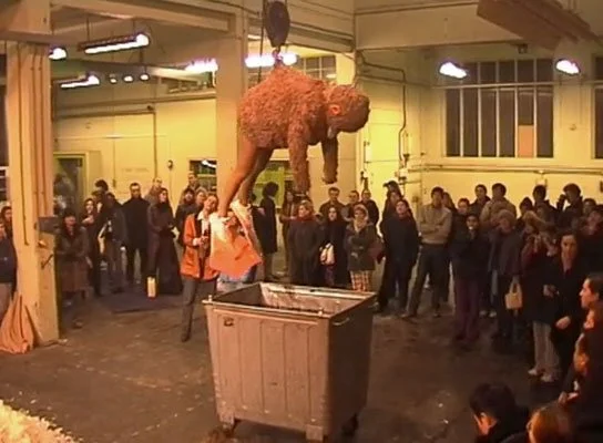 At some point a person from the audience picked up the remote control, lifted me up and slowly dipped me into the "tar". It took a while for him to hit the bin, because I was swinging several meters from side to side because of the long wire. After having dipped me into the tar, I was gently laid down again into the pile of feathers. Some from the audience joined in and started to cover me with feathers. Soon after this another person from the audience took over the remote control and dipped me again into the tar and feather. This was repeated over again three times before I gave a signal to stop the performance. During the whole performance I tried not to move but just to hang with my legs and arms down in the same "dead" position.