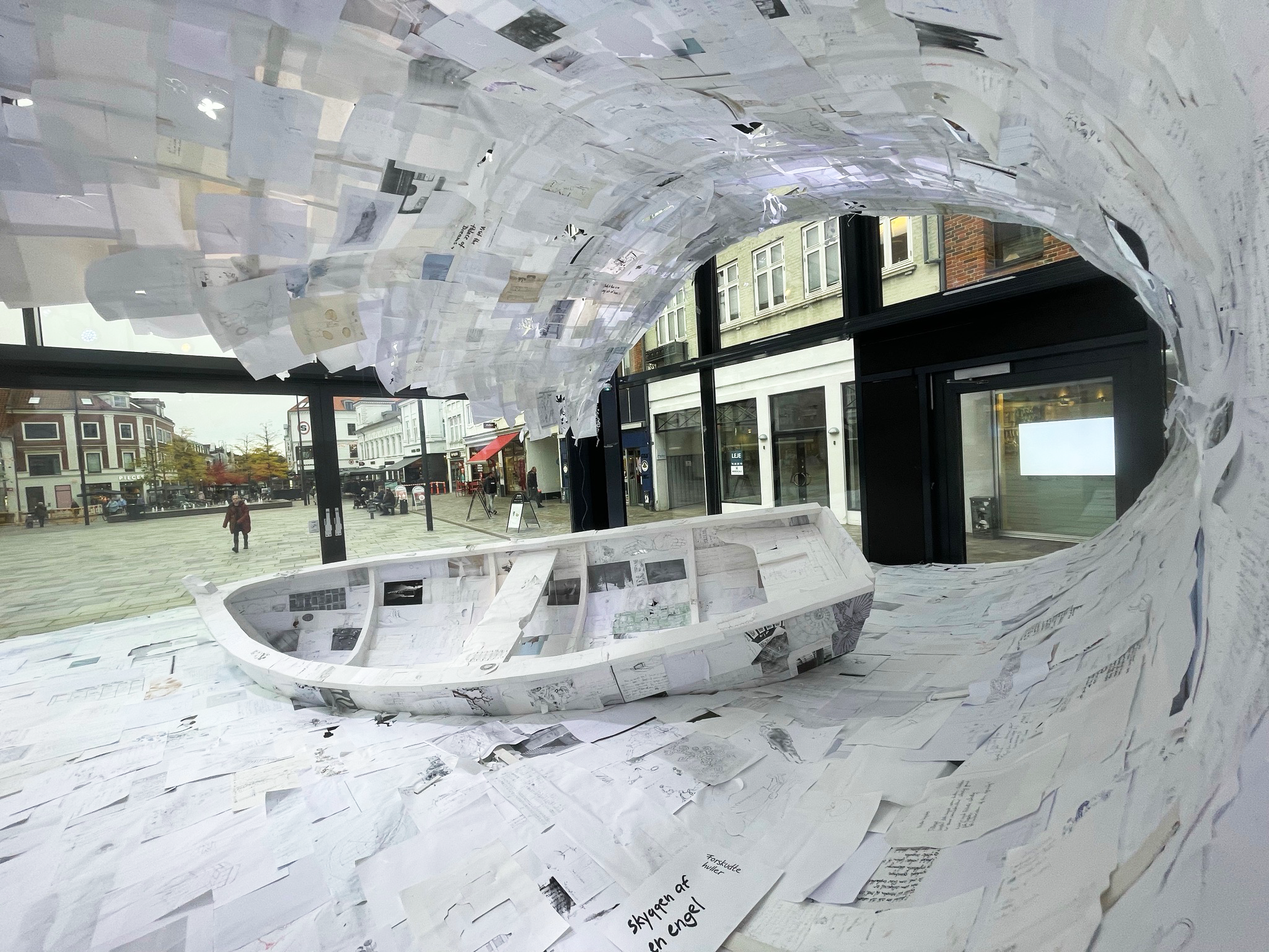 Paper installation displayed in KUBEN at Horsens pedestrian street Oct. 1 – Nov. 20 2021. The paper installation is shaped from leftover sketches, copies, cuttings and drawings from earlier works, all in A4 size. Merged together they form a giant paper ocean where small disasters and dramas unfold both above and below the surface. The Collage-surface is disrupted by a fragile dinghy, floating in the dramatic ocean.
