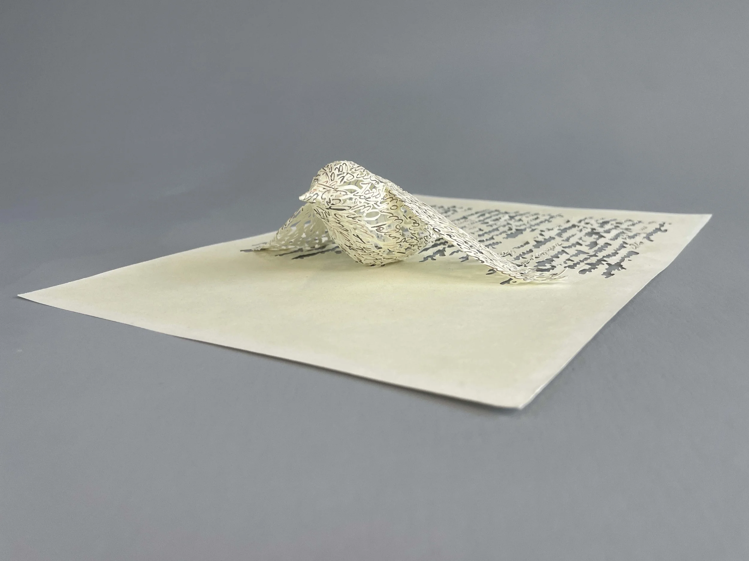 Bird made out of Karen Blixens poem Vinger. Handwritten text on A4 paper and glue.